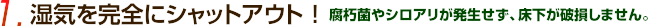 完全密封構造のため、外部からの湿気も完全遮断します。また、地中から上昇する湿気に対しても砂利層でストップ。砂利層には空気の移動がないため、それ以上は上昇しません。そしてその湿気は湿流作用により建物の外へ蒸発してしまいます。 SRC基礎は、湿気をシャットアウトし、また床下に木材を使用しないため、シロアリや腐朽菌の生育に必要な水分と栄養分が存在しないのです。よってシロアリや腐朽菌の発生はありません |